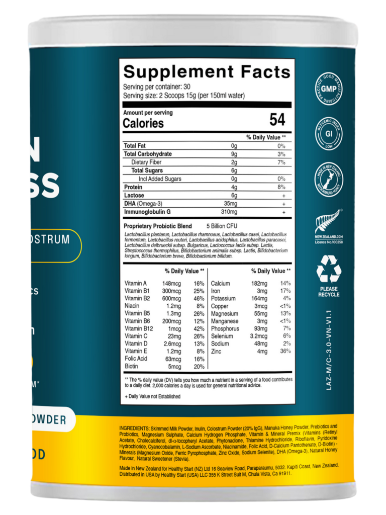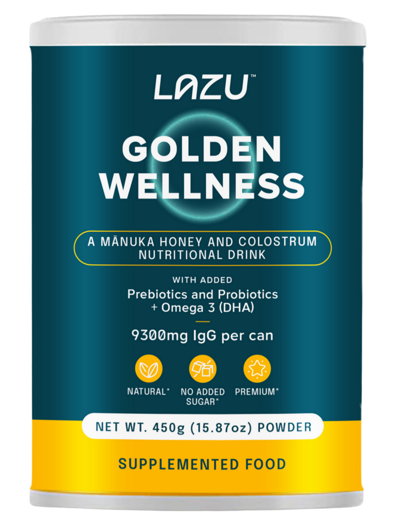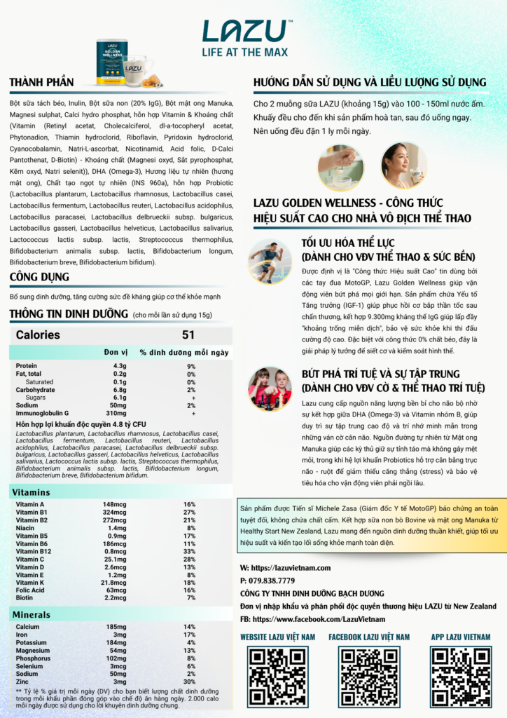 Sữa Non Lazu Golden Wellness - Sản phẩm nhập khẩu từ New Zealand. Sữa non chất lượng cao (IgG 20%), sữa tách béo, mật ong Manuka. Bổ sung Probiotics và Prebiotics, Omega 3 (DHA). Vitamin và khoáng chất: Vitamin A, B1, B2, B5, B6, B12, C, D, E, Niacin, Folic Acid và Biotin.