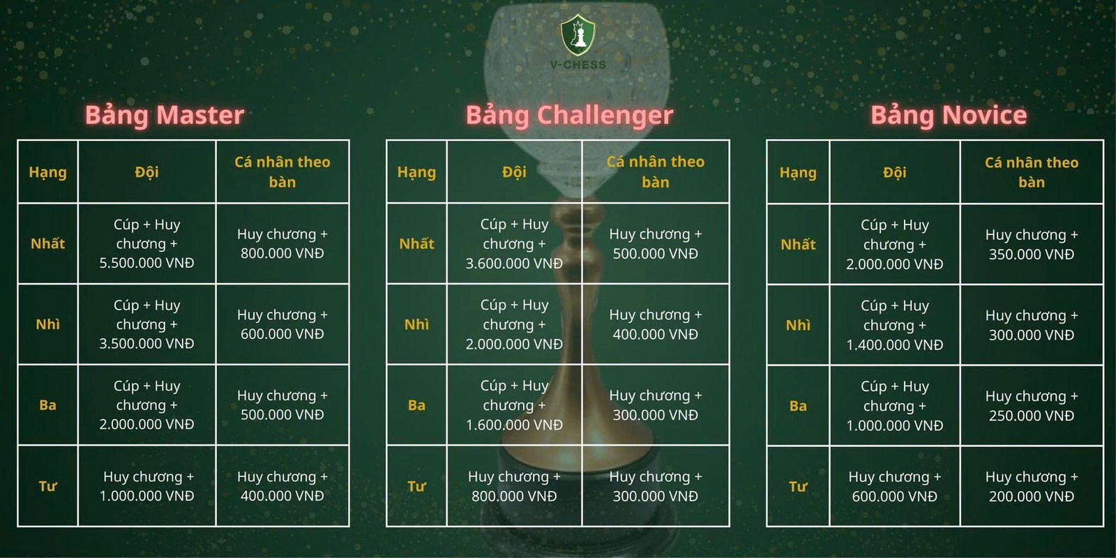 - Bảng Master: Vô địch nhận 5.500.000 VNĐ + Cúp + Huy chương.